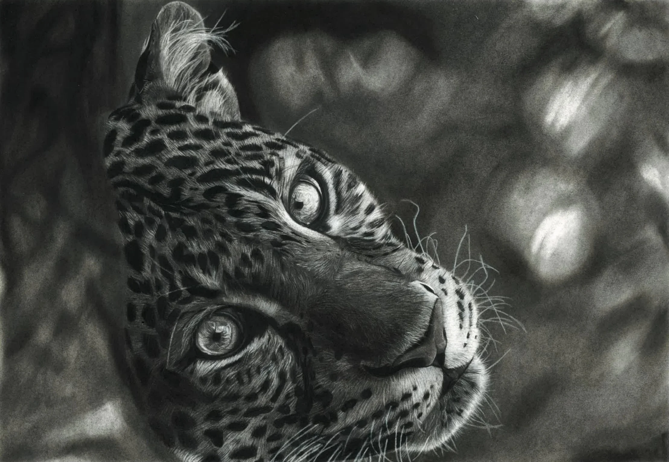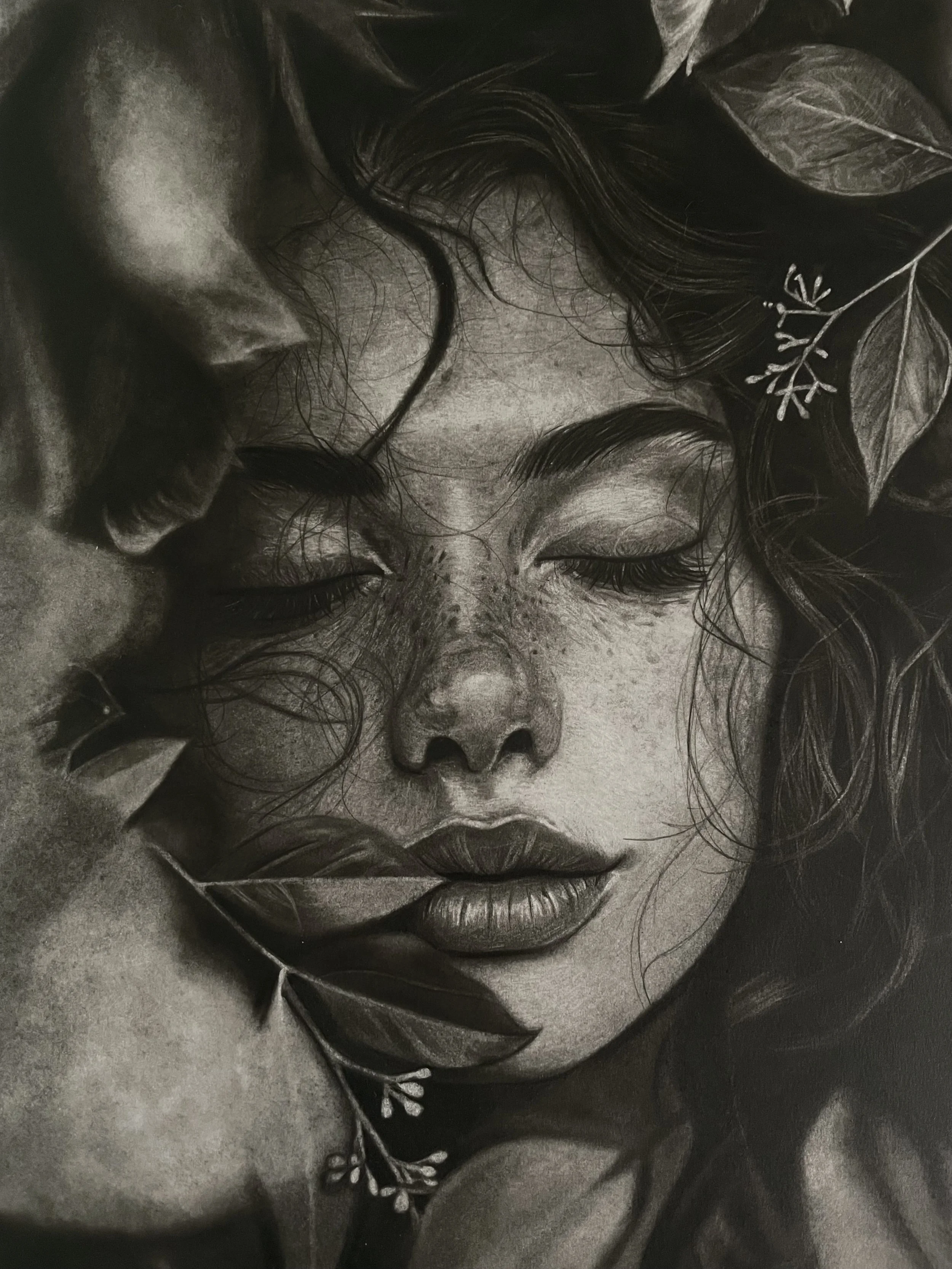 Un portrait en noir et blanc d'une femme avec des yeux expressifs, des feuilles et des branches projetées sur son visage, créant un effet d'ombre et de lumière. Voir en taille réelle