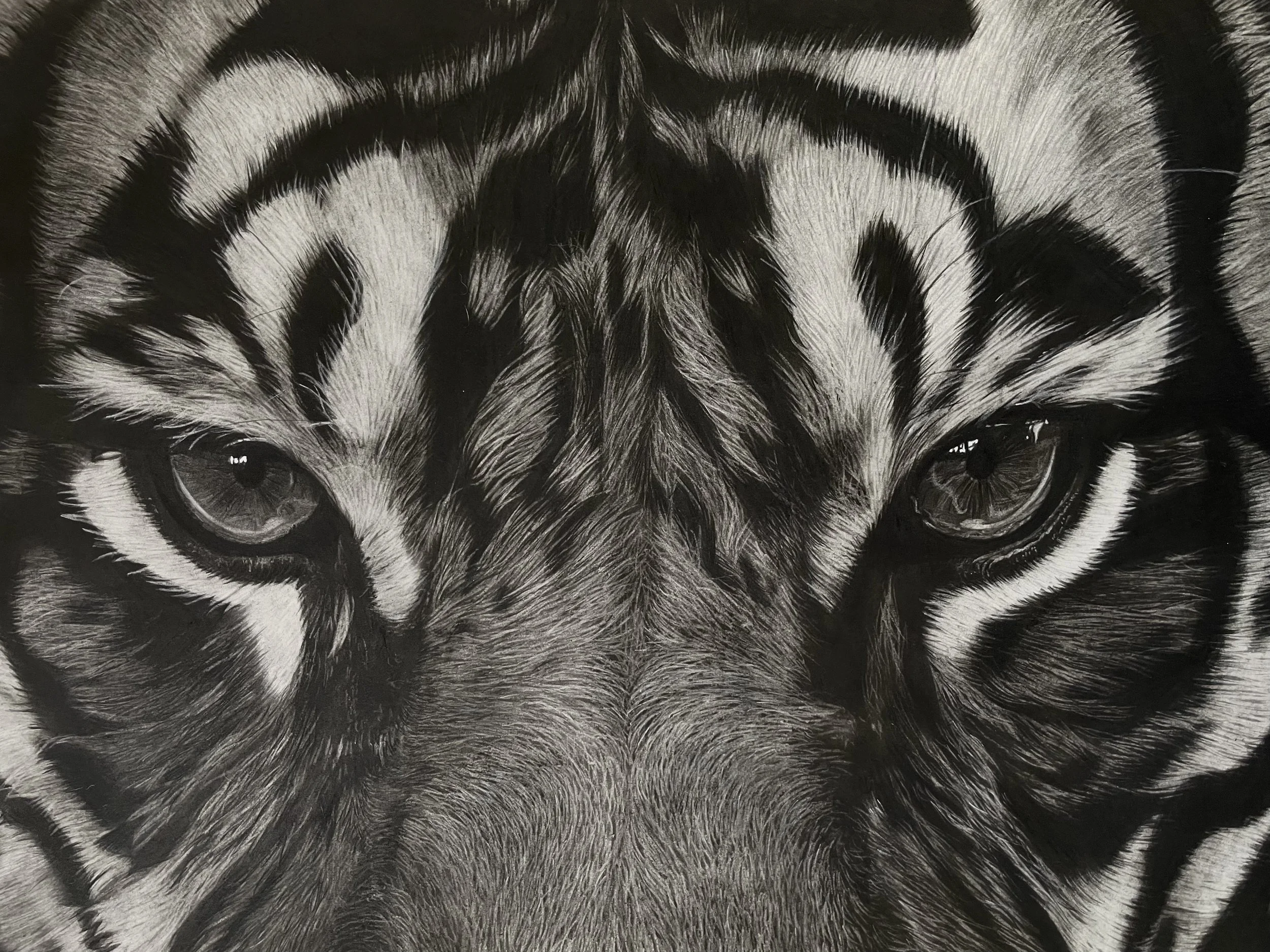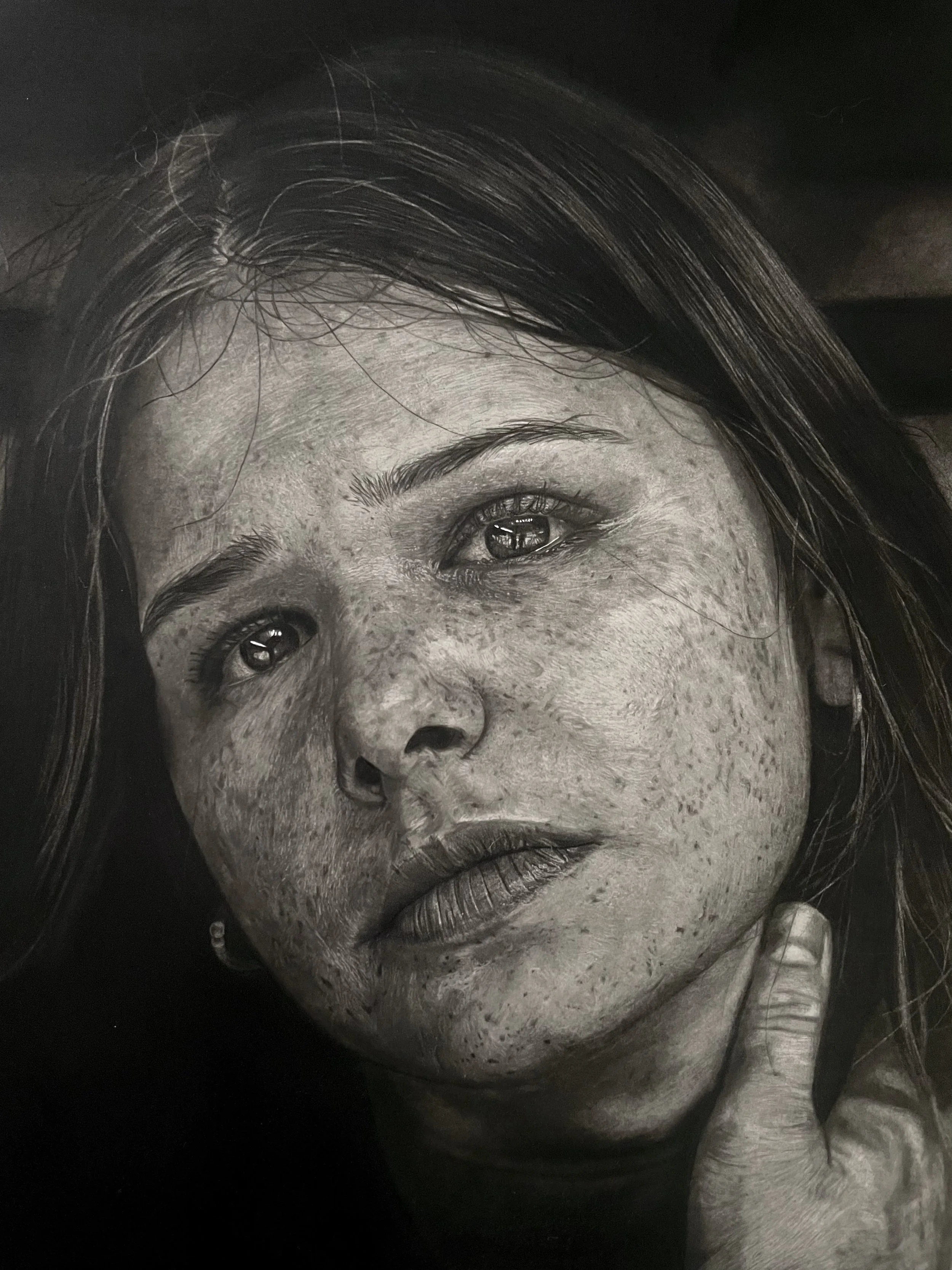 Un portrait réaliste en noir et blanc d'un jeune garçon avec des cheveux bouclés, un visage marqué par des imperfections et des cicatrices, regardant directement l'objectif. Voir en taille réelle